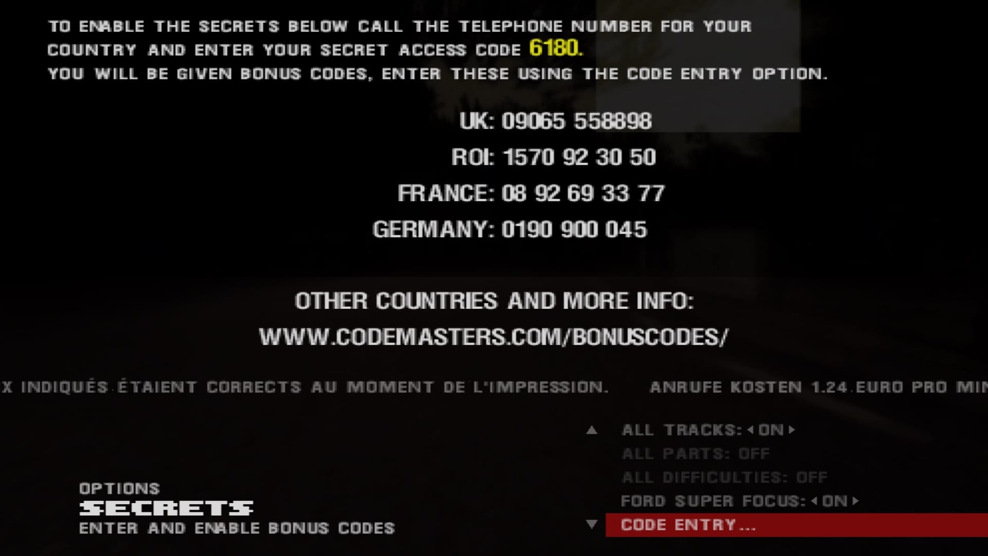 However, trying to type in a cheat offers up an impressive roadblock. When you go to Options > Secrets, you're brought to a screen where you're going to need a tool to input specific cheats to your game. This took me by surprise, as it's a clear effort by the Codemasters team back then to make you work for the cheats. However, thanks to Silent, a developer/modder, you can simply type in the four-digit code, and his tool will give you the right cheats.